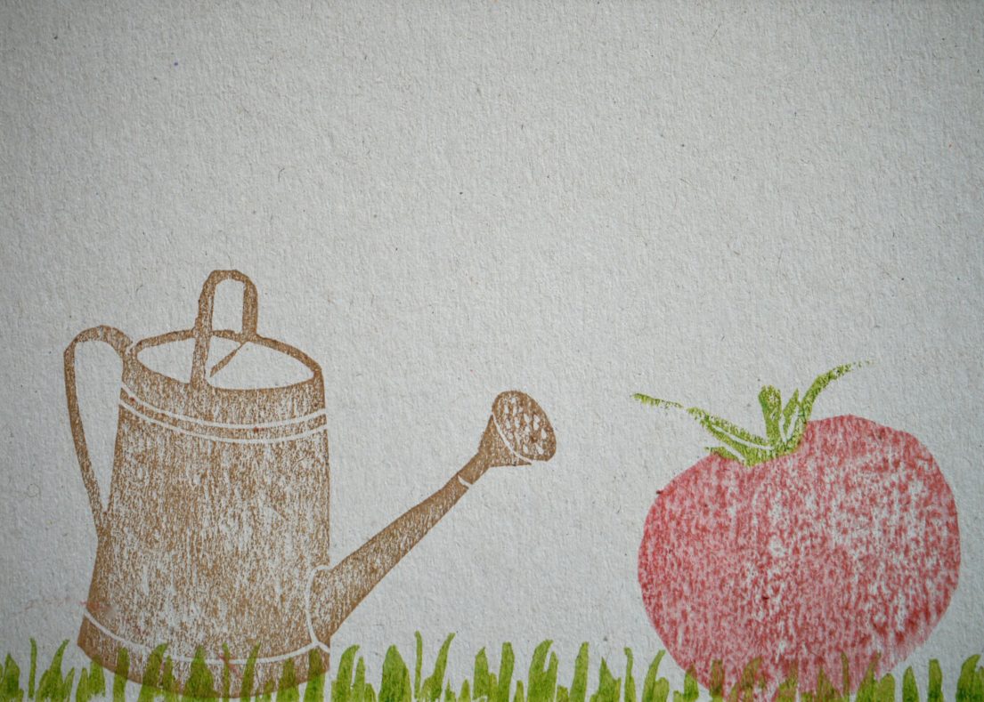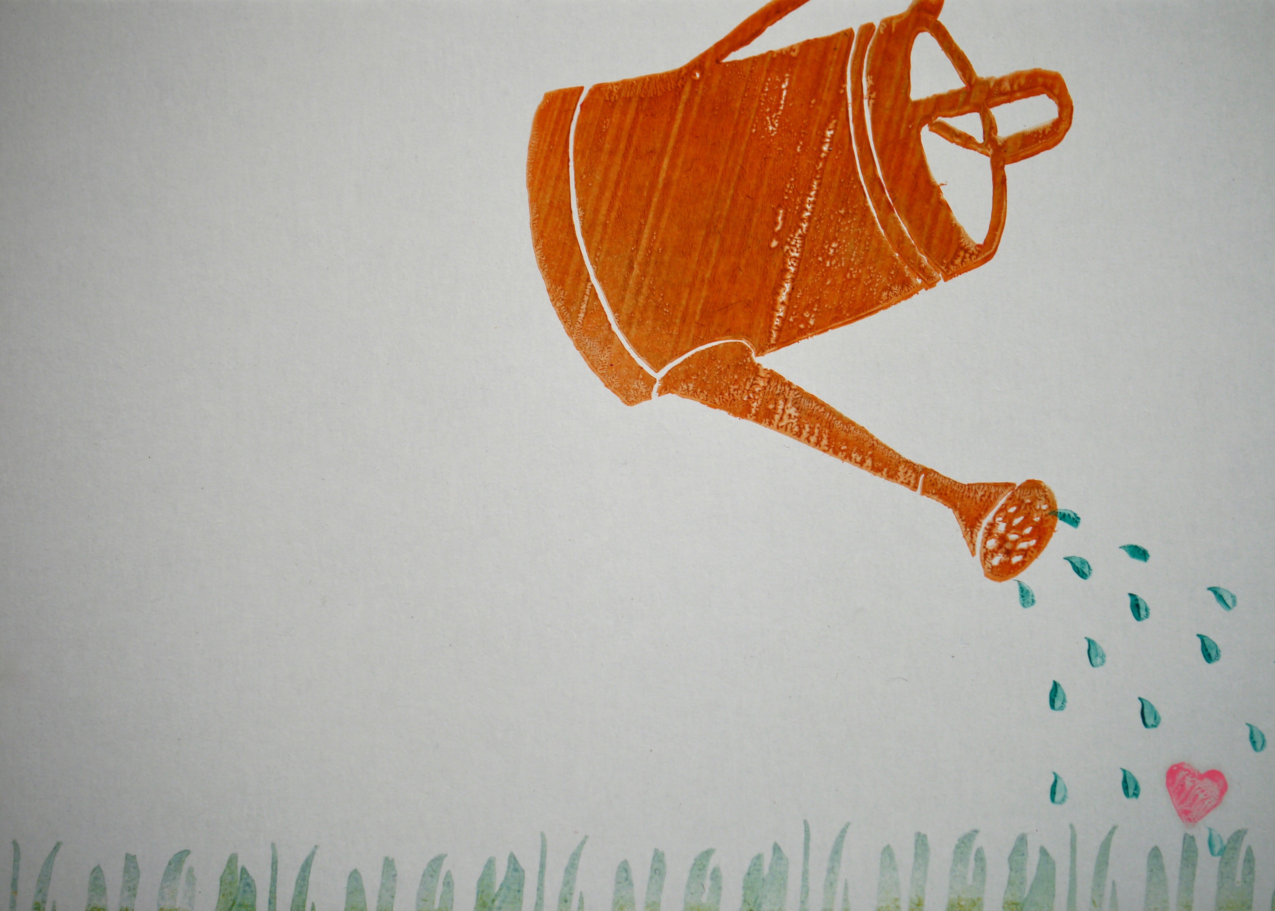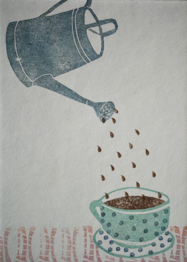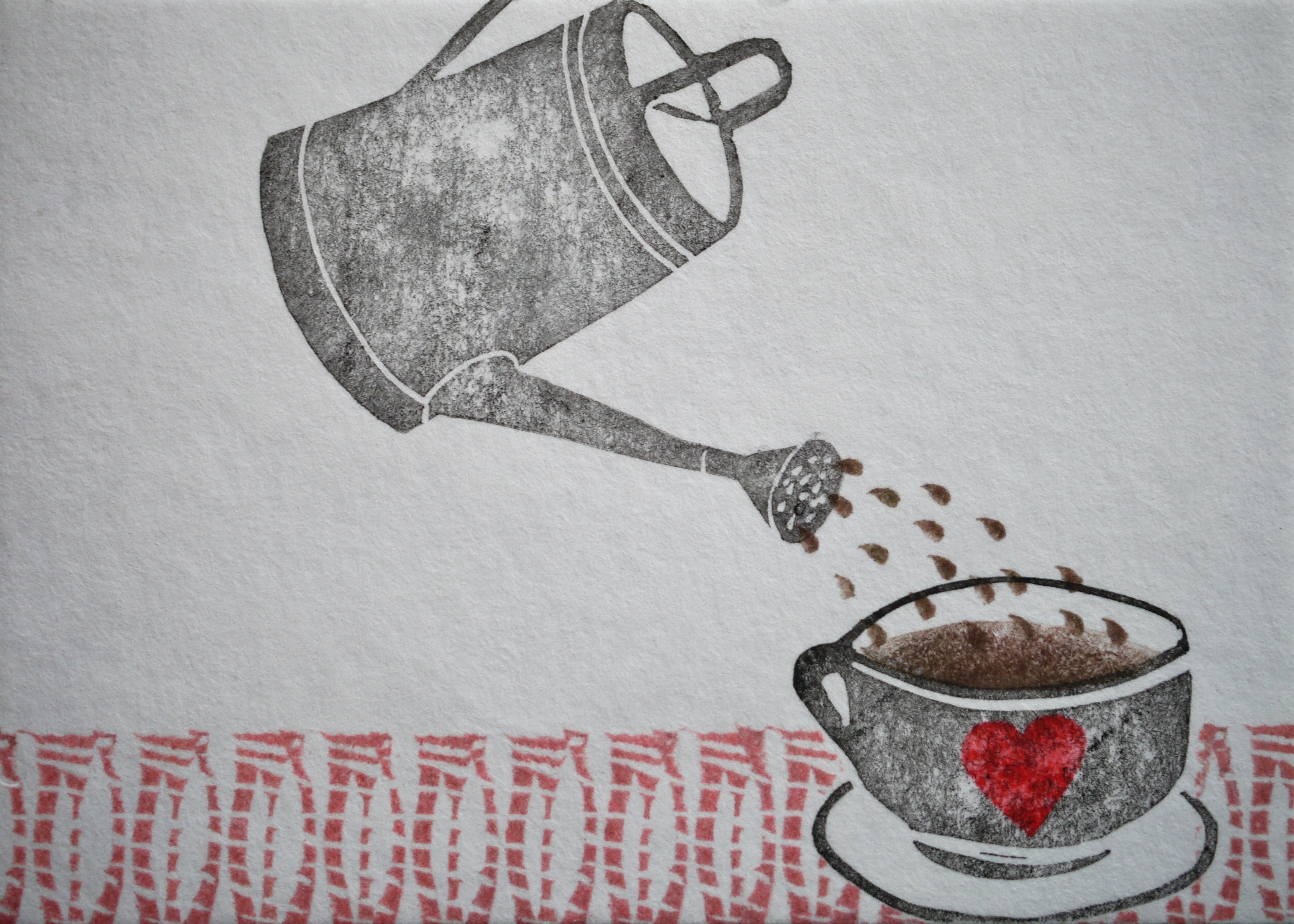 Giesskanne | 148 x 105 mm | von Hand auf Bierkarton gedruckt mit geschnitzten Stempeln | Unikate | diverse Motive | CHF 10.-
