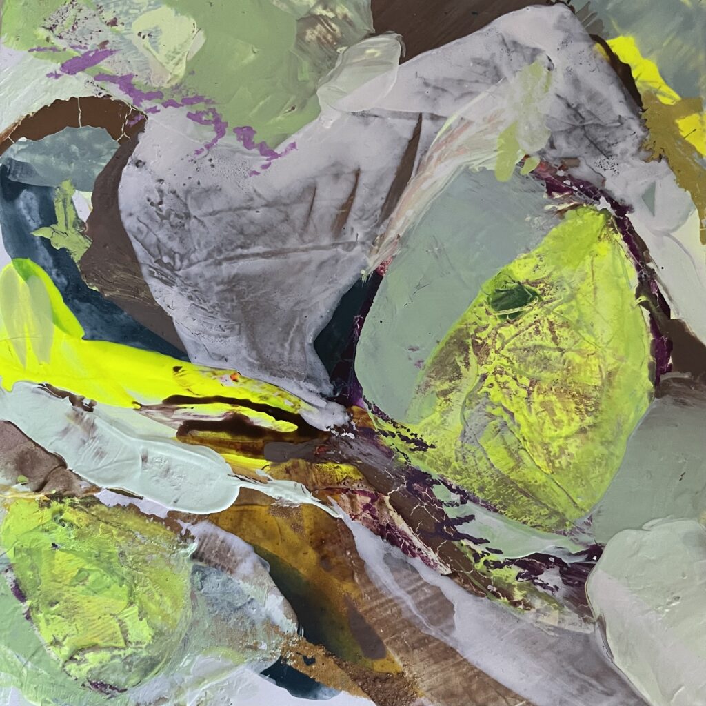 Zwischenschichten mit Neongelb | 15 x 15 x 5 cm | 2021 | Acryl/Pigment/Ölkreide auf Holzkörper |
